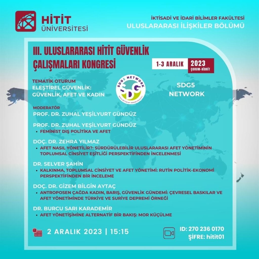 SDG5 Network, III. Uluslararası Hitit Güvenlik Çalışmaları Kongresi’nde Tematik Oturum düzenledi. – Eleştirel Güvenlik: Güvenlik, Afet ve Kadın / SDG5 NETWORK. Katılımcılar: Prof. Dr. Zuhal Yeşilyurt Gündüz (@ZuhalYeilyurtG1), Doç. Dr. Zehra Yılmaz (@y_zehra74942), Dr. Selver Şahin (@SelverBSahin), Doç. Dr. Gizem Bilgin Aytaç (@gizembilgin), Dr. Burcu Sarı Karademir (@brcsr_)