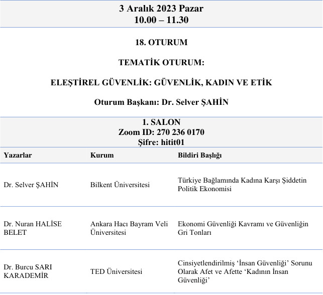 Dr. Burcu Sarı Karademir (@brcsr_ ),III. Uluslararası Hitit Güvenlik Çalışmaları Kongresi’nde “Eleştirel Güvenlik: Güvenlik, Kadın ve Etik” konulu panelde “Cinsiyetlendirilmiş ‘İnsan Güvenliği’ Sorunu Olarak Afet ve Afette ‘Kadının İnsan Güvenliği’” başlıklı çalışmasını sundu.