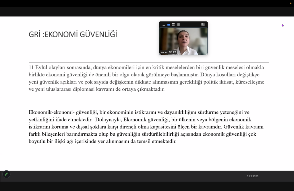 Dr. Nuran Belet (@nrnblt) III. Uluslararası Hitit Güvenlik Çalışmaları Kongresi’nde SDG5 Network’ün düzenlediği Tematik Oturumunda “Eleştirel Güvenlik: Güvenlik, Kadın ve Etik” konulu panelde “Ekonomi Güvenliği Kavramı ve Güvenliğin Gri Tonları” başlıklı çalışmasını paylaştı.