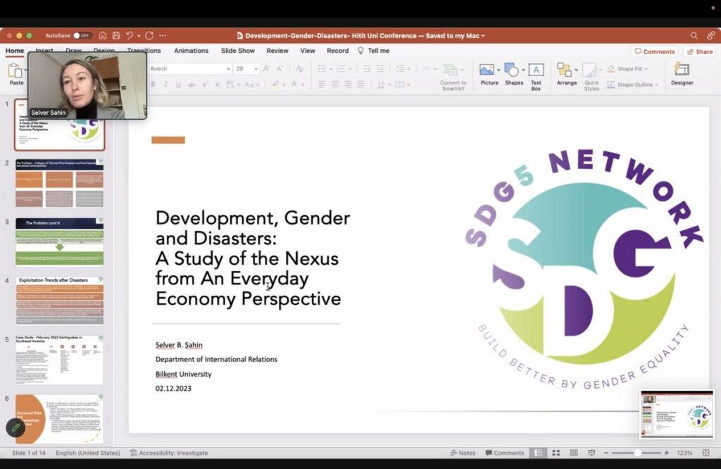 Doç. Dr. Selver B. Şahin (@SelverBSahin), III. Uluslararası Hitit Güvenlik Çalışmaları Kongresi’nde Tematik Oturumunda, “Toplumsal Cinsiyet ve Afet Yönetimi: Rutin Politik-Ekonomi Perspektifinden Bir İnceleme” konuşmasında kadınların emeklerinin sömürülmesinden ve bunun kadınları afette nasıl kırılganlaştırdığını anlattı.
