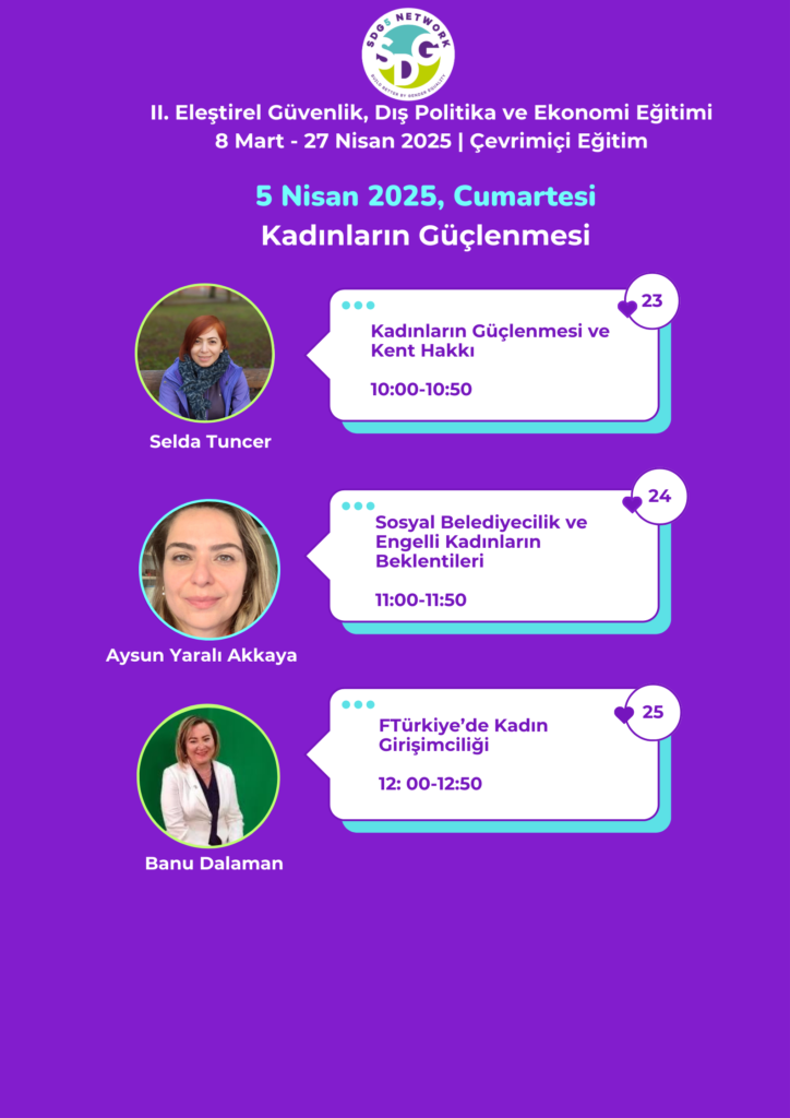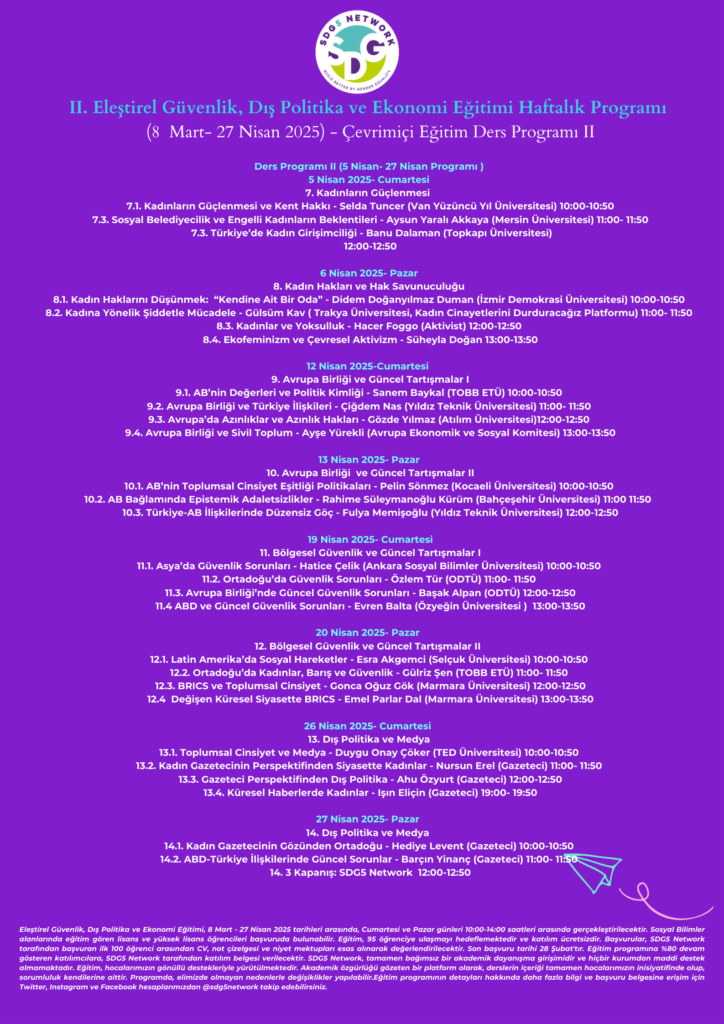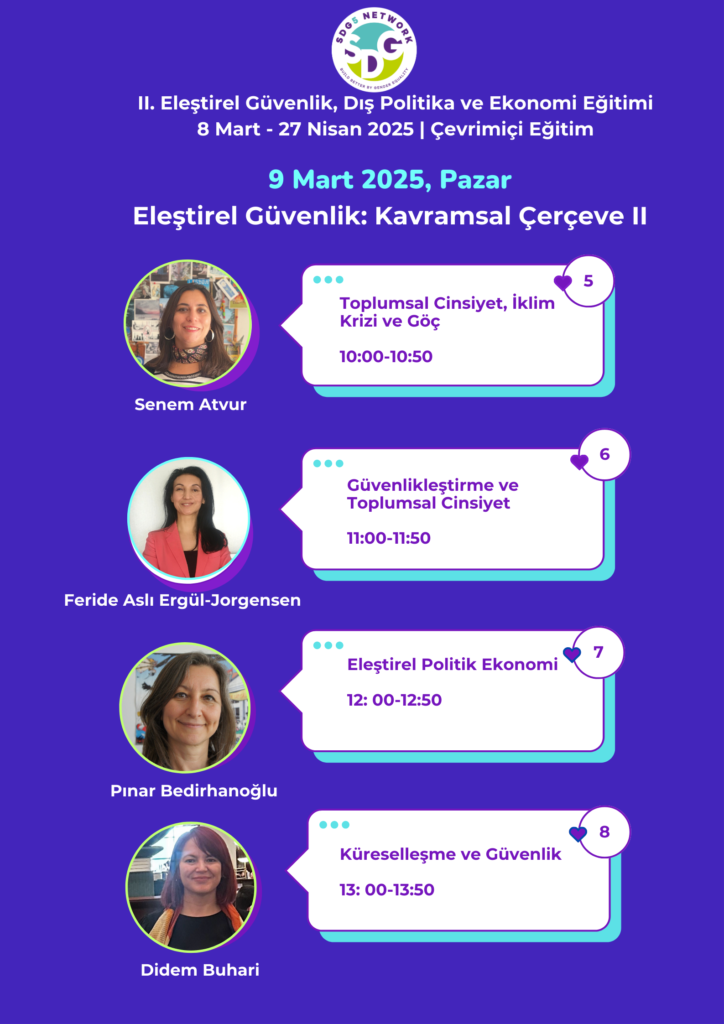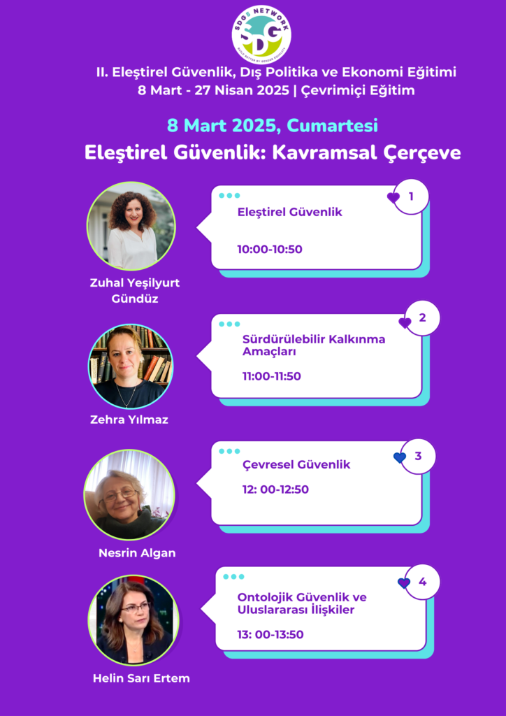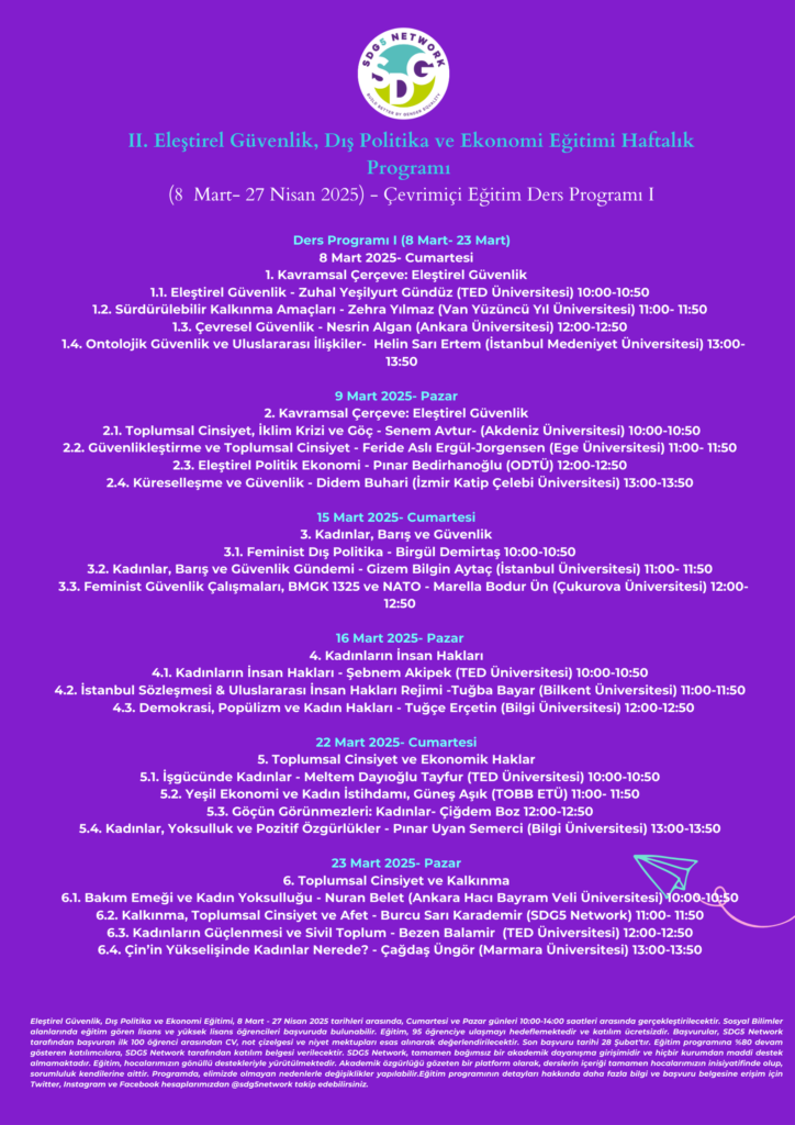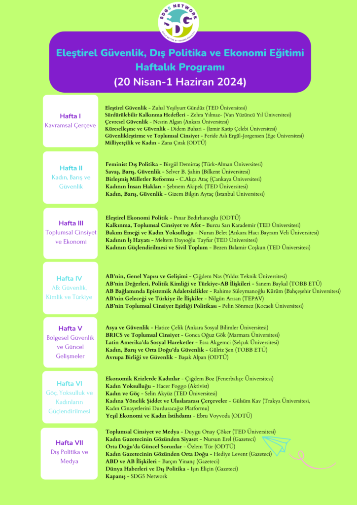 SDG5 Network tarafından düzenlenen Eleştirel Güvenlik, Dış Politika ve Ekonomi Eğitimi, 8 Mart- 27 Nisan 2025 tarihleri arasında gerçekleşmiştir.
