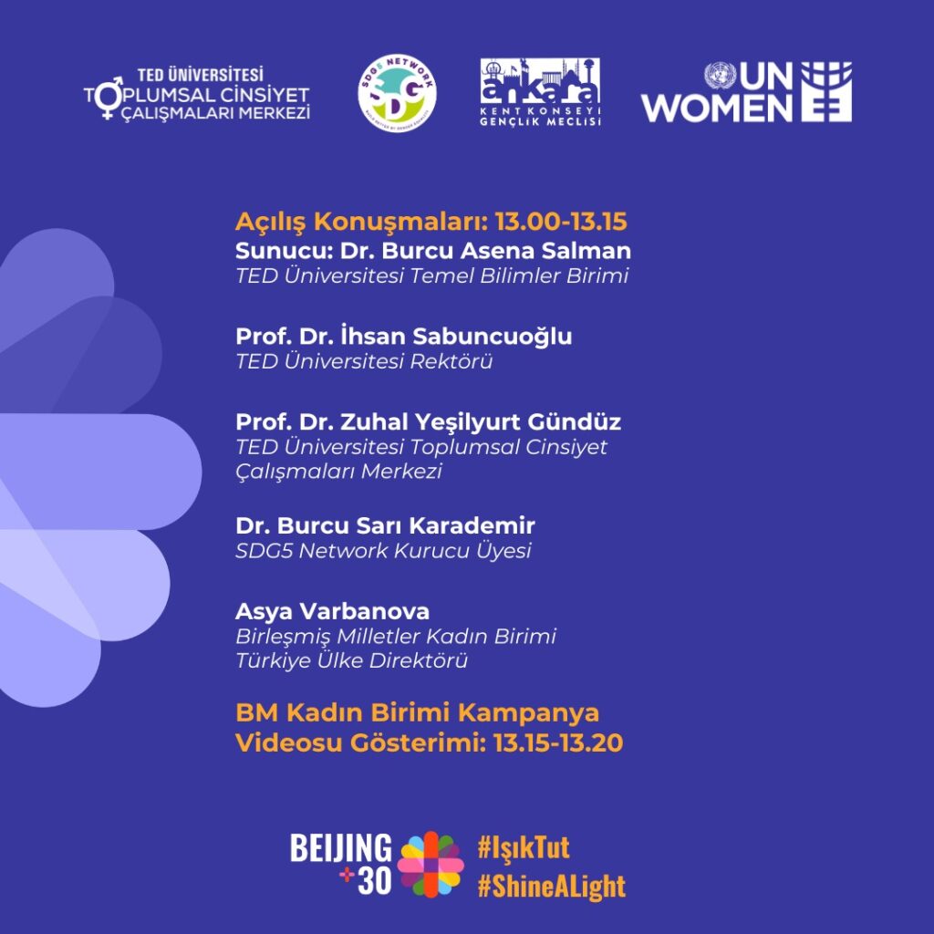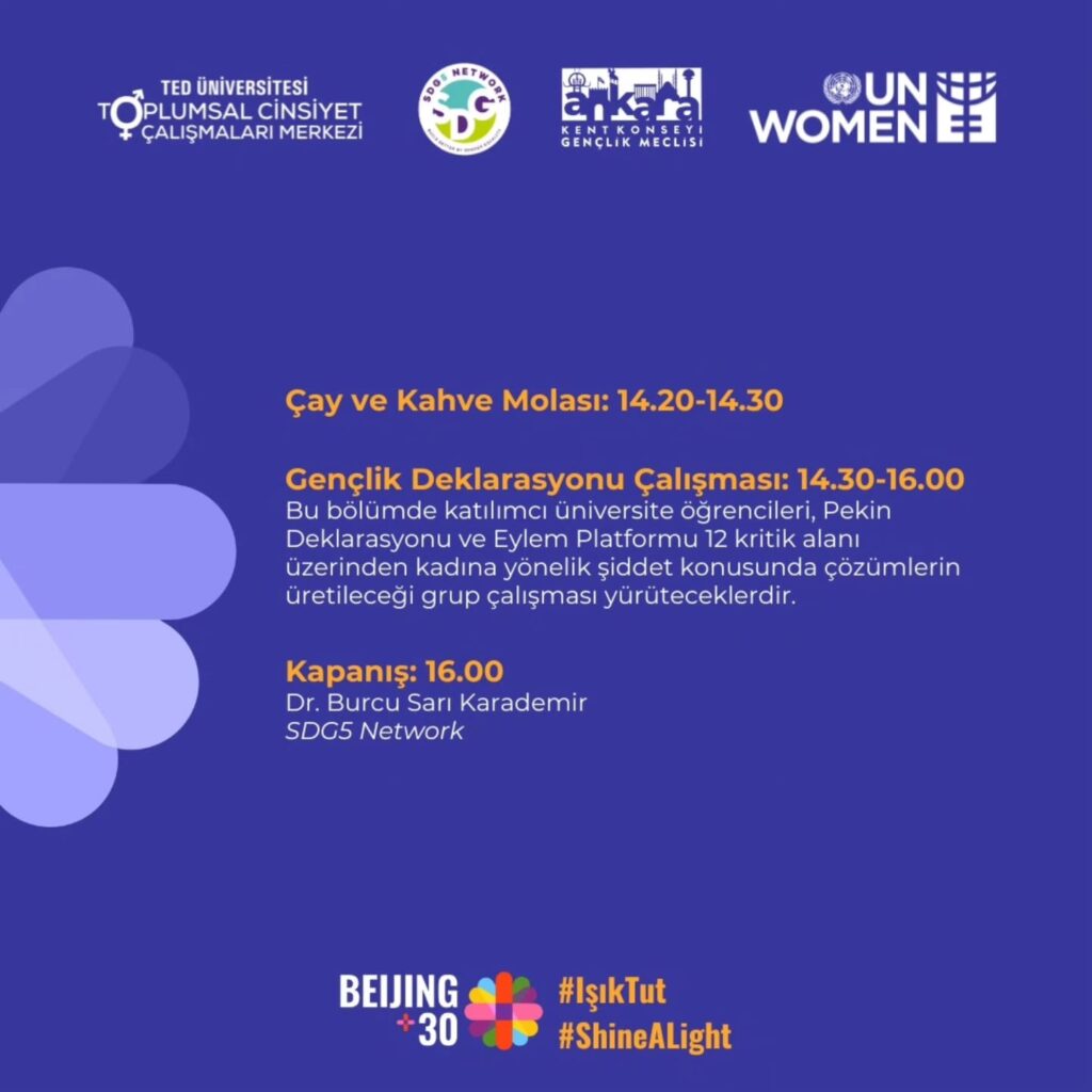 28 Kasım’da, SDG5 Network, UN Women Kadın Birimi, TED Üniversitesi Toplumsal Cinsiyet Merkezi, ve Ankara Gençlik Kent Konseyi işbirliği ile TED Üniversitesi’nde  “Pekin Deklarasyonu ve Eylem Platformu’nun 30. Yılına Doğru: Kadına Yönelik Şiddete Işık Tut – Nedenler, Sonuçlar, Çözümler” başlıklı etkinlik gerçekleştiriltirildi.