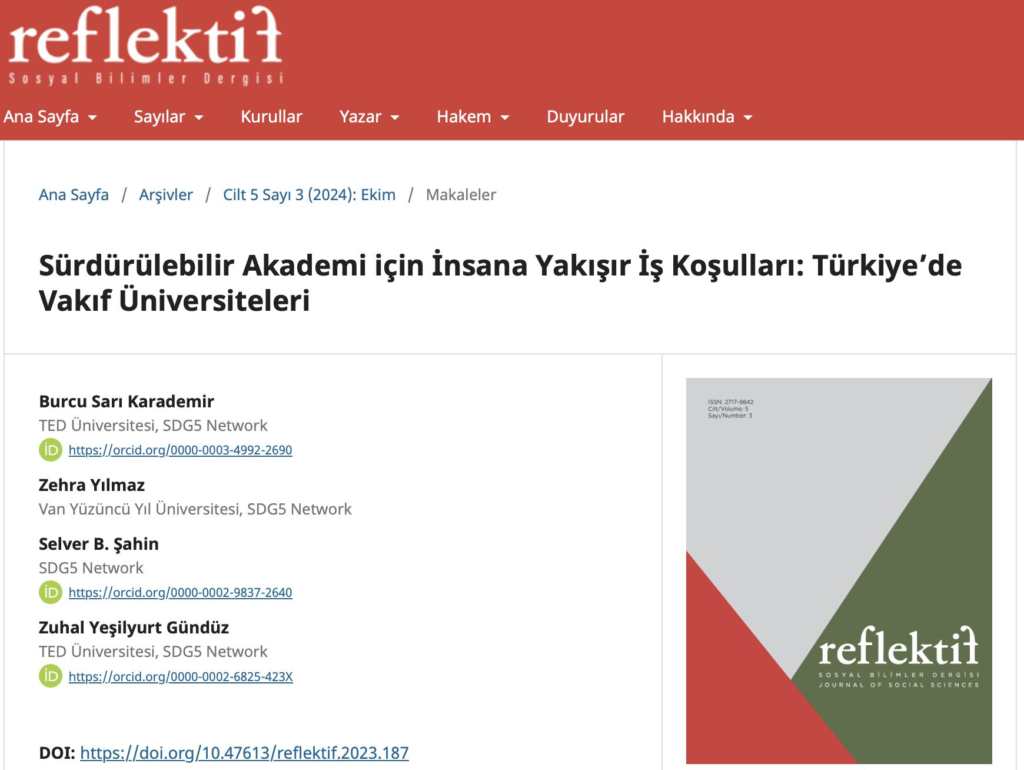 SDG5 Network üyeleri tarafından yazılan, ‘Sürdürülebilir Akademi için İnsana Yakışır İş Koşulları: Türkiye’de Vakıf Üniversiteleri / Decent Work Conditions for Sustainable Academia: The Foundation Universities in Turkey’ başlıklı çalışma Reflektif Sosyal Bilimler dergisinde yayımlandı.